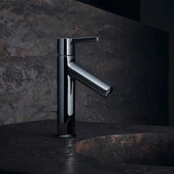 - Timeless by design, AXOR Starck evokes the primitive hand pump, humanity’s earliest means of drawing water. Encasing an ultra-slim cartridge to regulate the flow-rate, the iconic single-lever faucet consists of two cylinders – one a vertical base, the other a diagonal spout – crowned by a choice of pin or feather handle. Simple, rational, reduced to the essential, the mixers are adaptable to any bathroom décor.