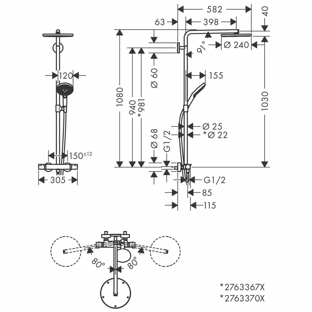 - Shower bar diameter: 25 mm, for surfaces 670 and 700: 22mm